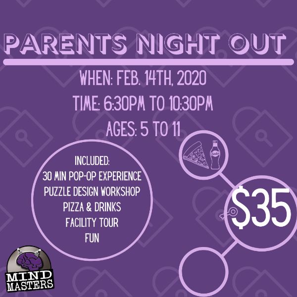 This is great for ages 5 to 11, they will enjoy an escape room POP-OP, build a puzzle side by side with the Owners and designers, Pizza dinner, games and more!! There is limited space please book as soon as possible.