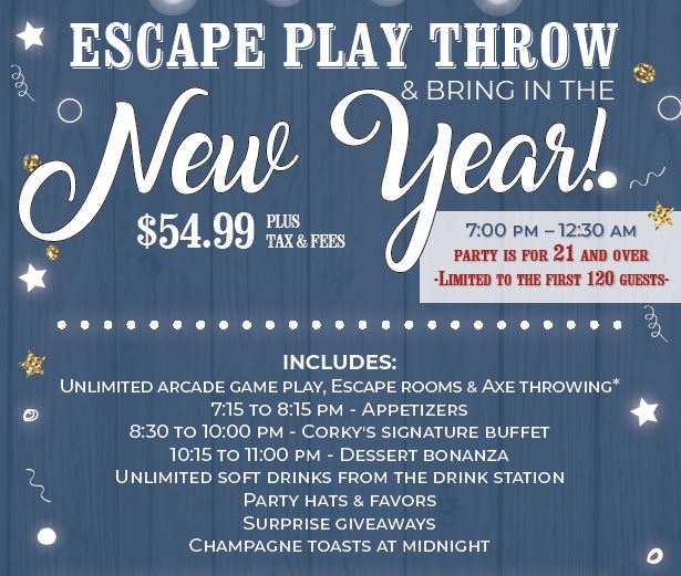 Doors will open at 7:00pm. All guest receive a 4hr complimentary game card along with party favors and raffle ticket for door prizes. Each Axe Throwing and Escape Room event will be shared with other guests to maximize the lanes and rooms. Complimentary appetizers, food, deserts and soft drink will be available to all guest with entrance ticket. Bar specials will be ongoing throughout the evening.